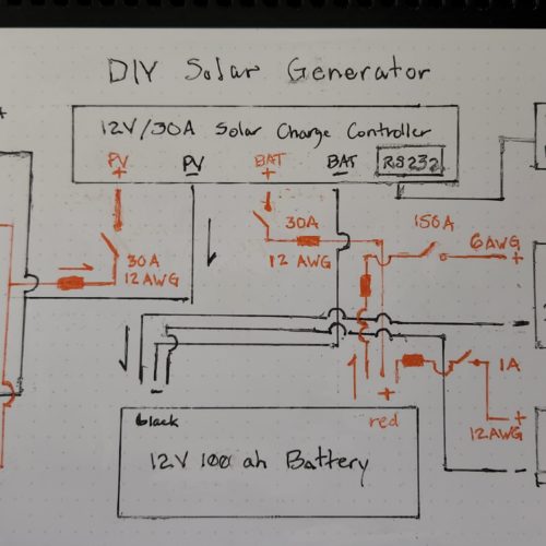 Lastly, I drew up the electrical schematics of my DIY solar generator and adhered to certain standards – wire gauge size based on amperage and followed safety guidelines for DC circuits to wire the fuse before an on/off switch. So when the fuse trips, it will protect any devices behind it.
